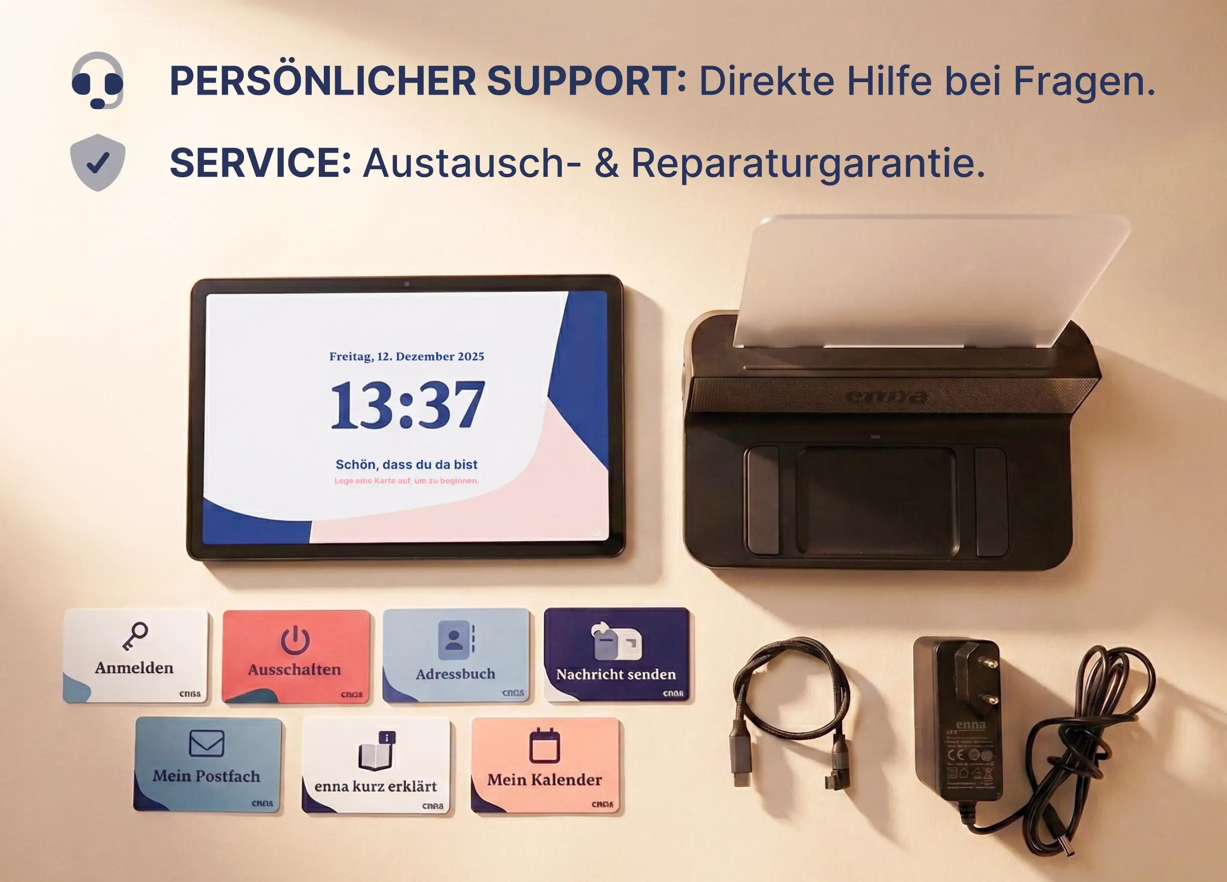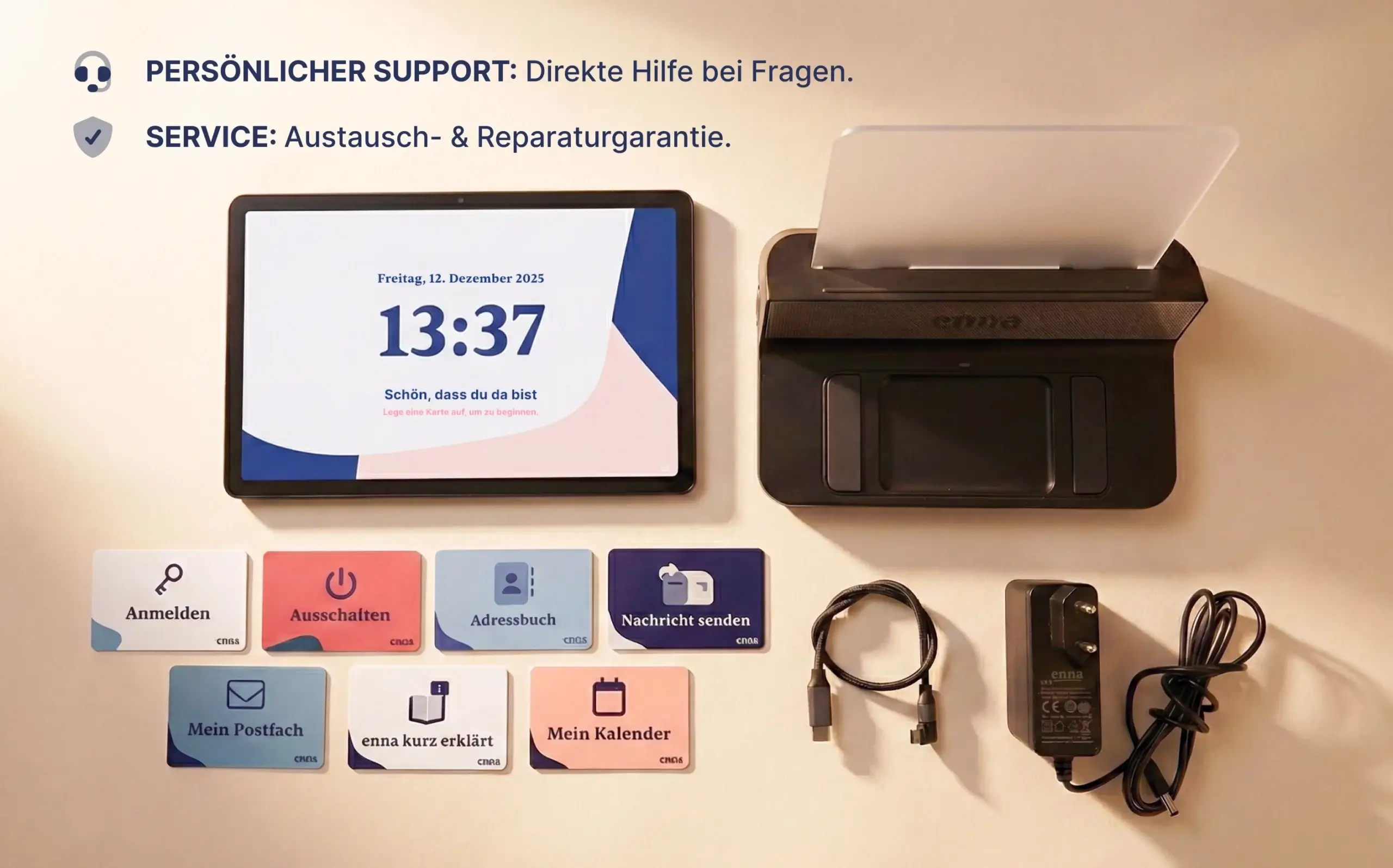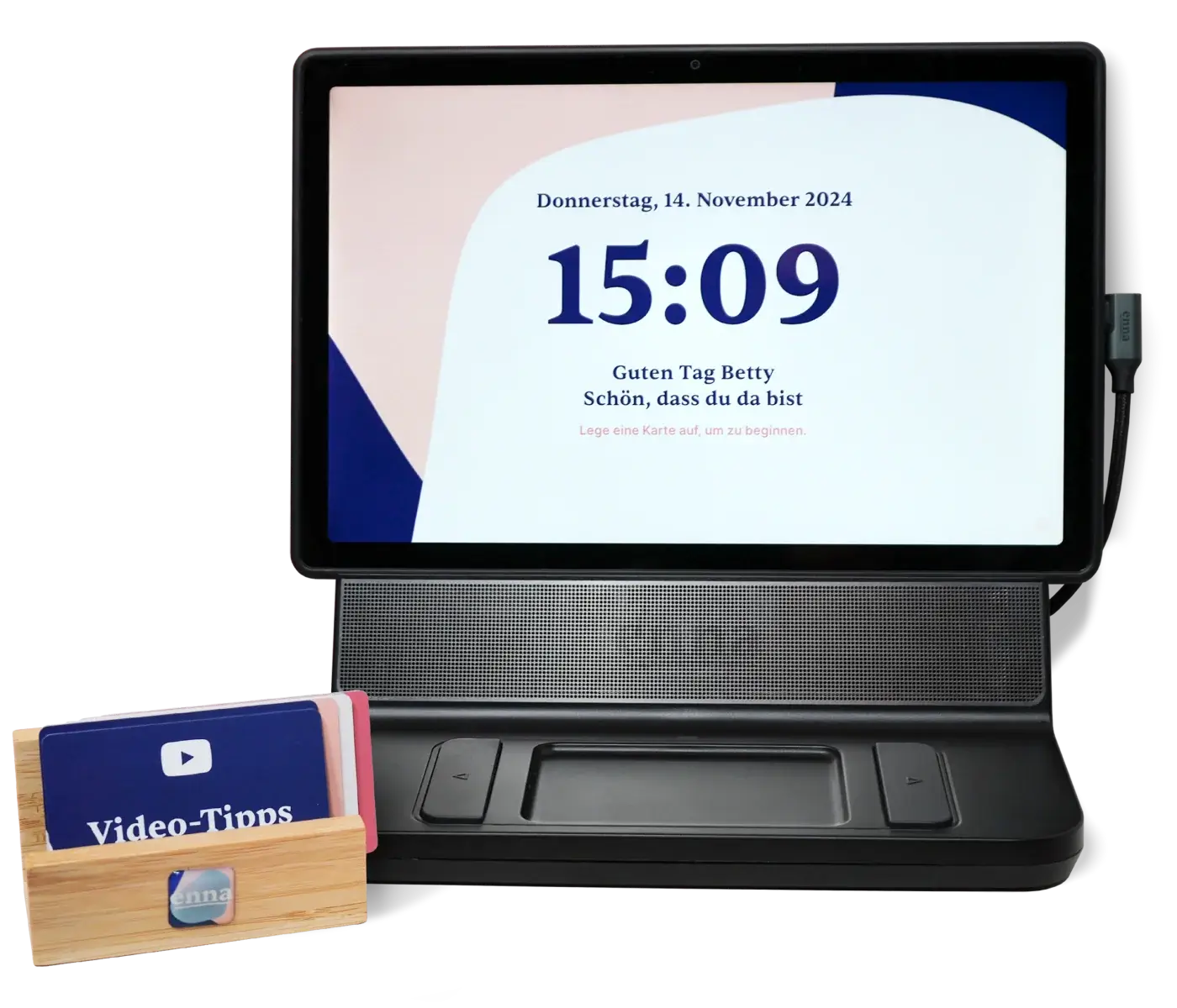 Die einfachste Videotelefonie der Welt. Auspacken, einstecken, Karte auflegen. Das einzige Tablet, das Senioren sofort lieben.