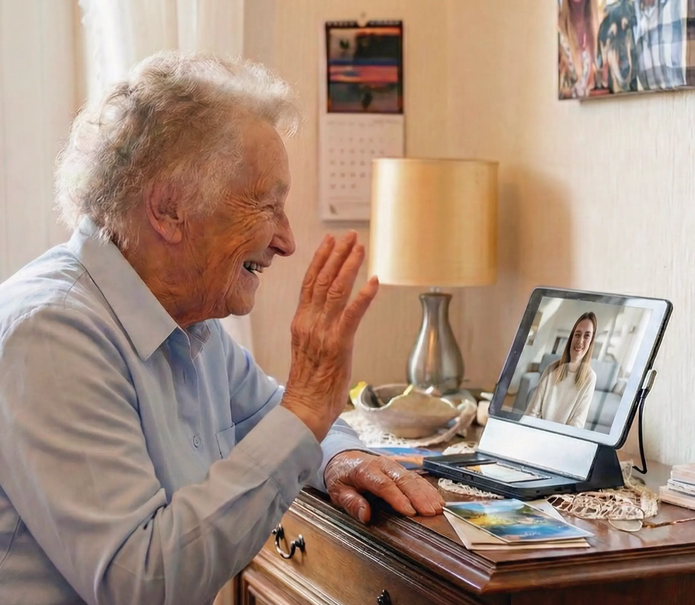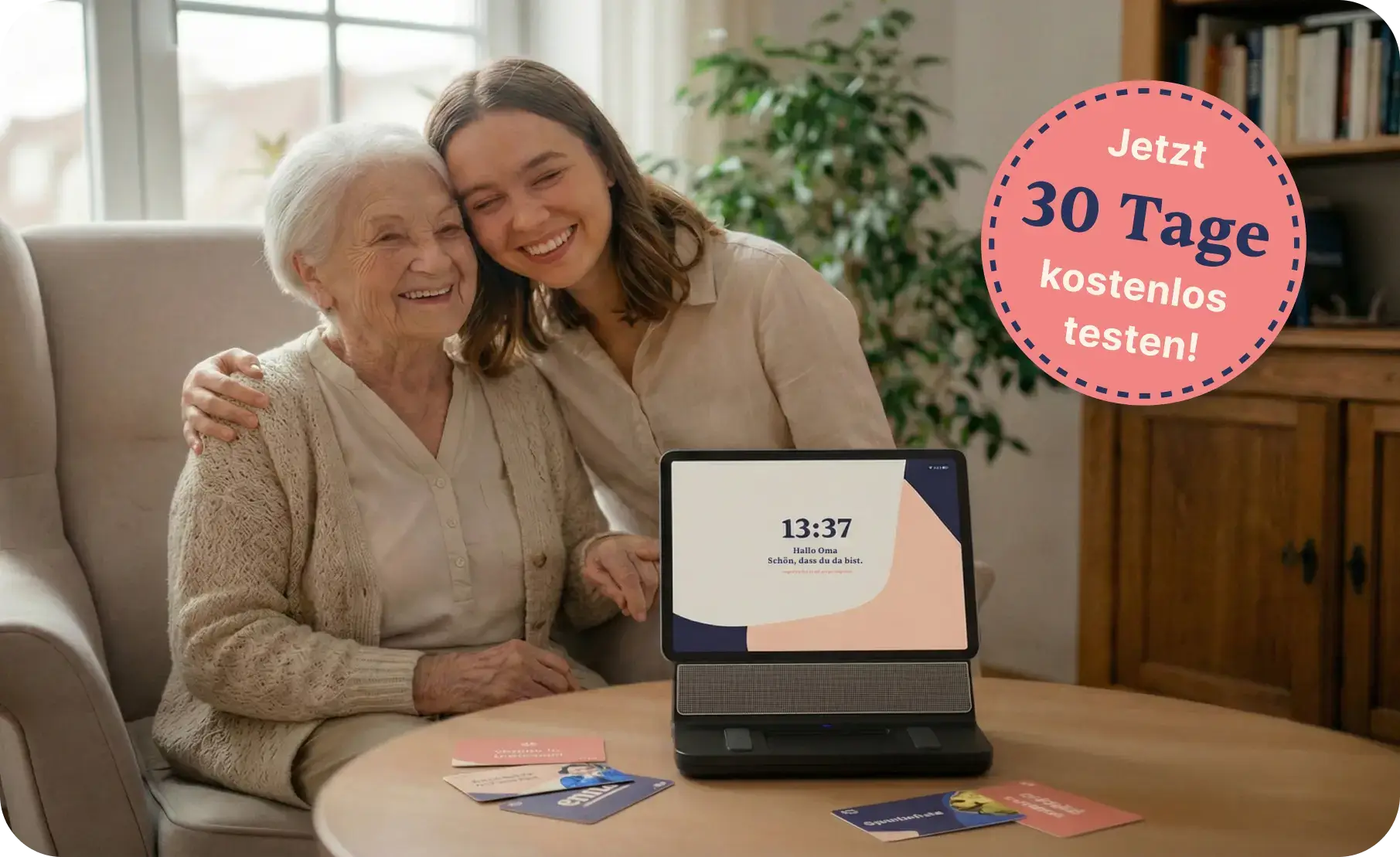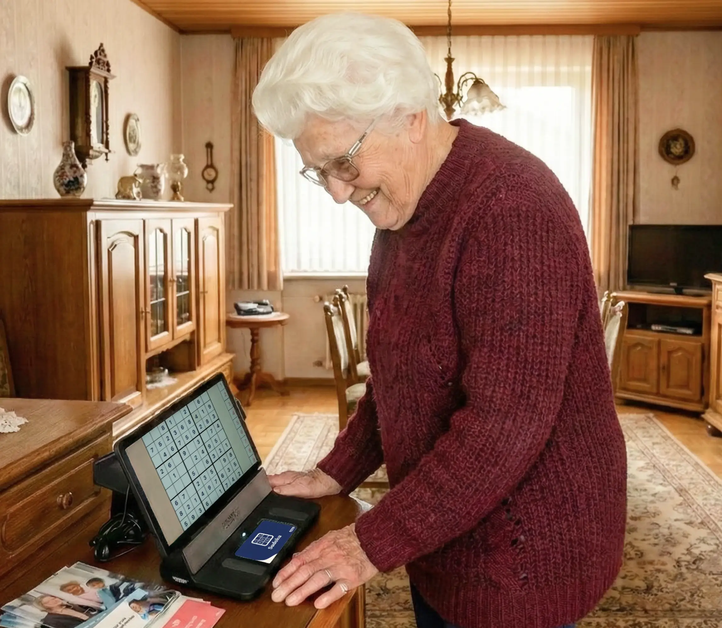 Die einfachste Videotelefonie der Welt. Auspacken, einstecken, Karte auflegen. Das einzige Tablet, das Senioren sofort lieben.